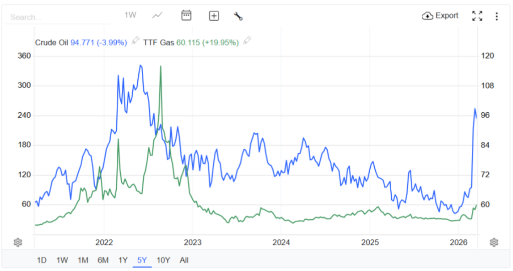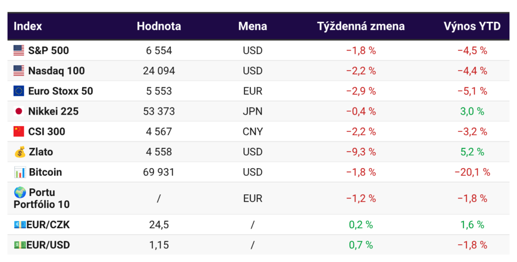 Akciové trhy sú už tretí týždeň pod tlakom kvôli pokračujúcej vojne v Iráne. Poklesy sú však zatiaľ relatívne mierne. Objavili sa aj nové útoky na plynové terminály v Iráne a Katare, čo skokovo zdražuje cenu plynu. Bezpečný prístav v čase geopolitického napätia nepotvrdzuje zlato, ktoré za posledný týždeň kleslo o 9 %.