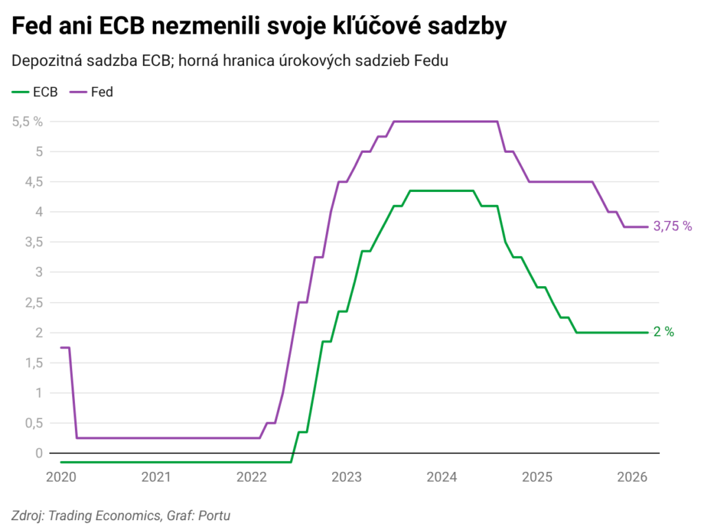 Počkáme a uvidíme. Svoje kľúčové úrokové sadzby v týždni nezmenila americká ani európska centrálna banka. Sadzby v USA zostávajú v pásme 3,5-3,75 %, depozitná sadzba v eurozóne na 2 %. Pozornosť trhov sa presunula predovšetkým k novým výhľadom a komentárom centrálnych bankárov. Tí zostávajú opatrní kvôli energetickým šokom spojeným s konfliktom na Blízkom východe, keď geopolitická neistota obmedzuje priestor na znižovanie sadzieb a môže tento krok odsunúť.