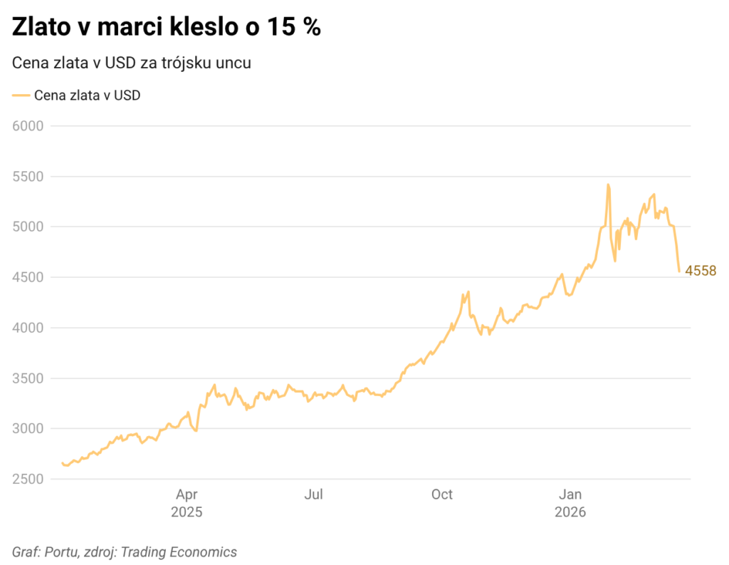 Útok na bezpečný prístav. Cena zlata sa v marci pod tlakom geopolitických a makroekonomických udalostíprepadla už o 15 % na 4 558 USD. Práve v čase neistoty a ozbrojených konfliktov sa pritom má zlatu dariť, ale rastúce ceny ropy zamiešali karty, keďže opäť rastú inflačné tlaky. Centrálne banky, najmä americký Fed, tak budú musieť vyčkávať so znižovaním úrokových sadzieb, aby zabránil výraznejšiemu rastu cien. To viedlo k posilneniu dolára, v ktorom sa obchoduje zlato, a následnemu oslabeniu drahých kovov.