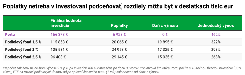 Náš príklad počíta s rovnakým scenárom z pohľadu výnosnosti investičných portfólií Portu aj portfólií podielových fondov. Všetky fondy po dobu 30 rokov dosahovali rovnaký výnos 9 % ročne a investor každý mesiac vložil na svoj investičný účet 100 eur. Jediný rozdiel je tak výška poplatkov a povinné 19 % zdanenie výnosu podielových fondov. Ako možno vidieť rozdiel v znamení jedného percenta, nakoniec spravil rozdiel v desiatkach tisíc eur.